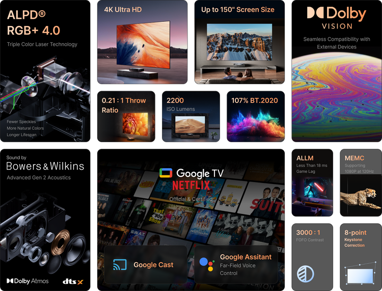 Engineered by Appotronics, ALPD® RGB+ 4.0 triple-color laser technology delivers extraordinary performance that outshines standard RGB laser projectors. Experience vibrant, true-to-life colors that elevate every scene with stunning natural precision. With impressive light efficiency, this technology boasts a laser lifespan of up to 30,000 hours, ensuring consistent brightness without the hassle of frequent replacements. Plus, advanced speckle suppression effectively eliminates distracting artifacts, resulting in a smoother, clearer image for a truly riveting viewing experience.